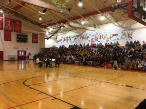 A few days later we were with all her classmates at Pine Ridge High School. The Dakota String Quartet and Dakota Wind Quintet (principal players of the South Dakota Symphony) were there to play the kids’ pieces for their whole school. Emily was almost unrecognizable – stylishly dressed, able to talk confidently about her piece (“just nice sounds I like, put together”), roundly applauded by hundreds of her peers.